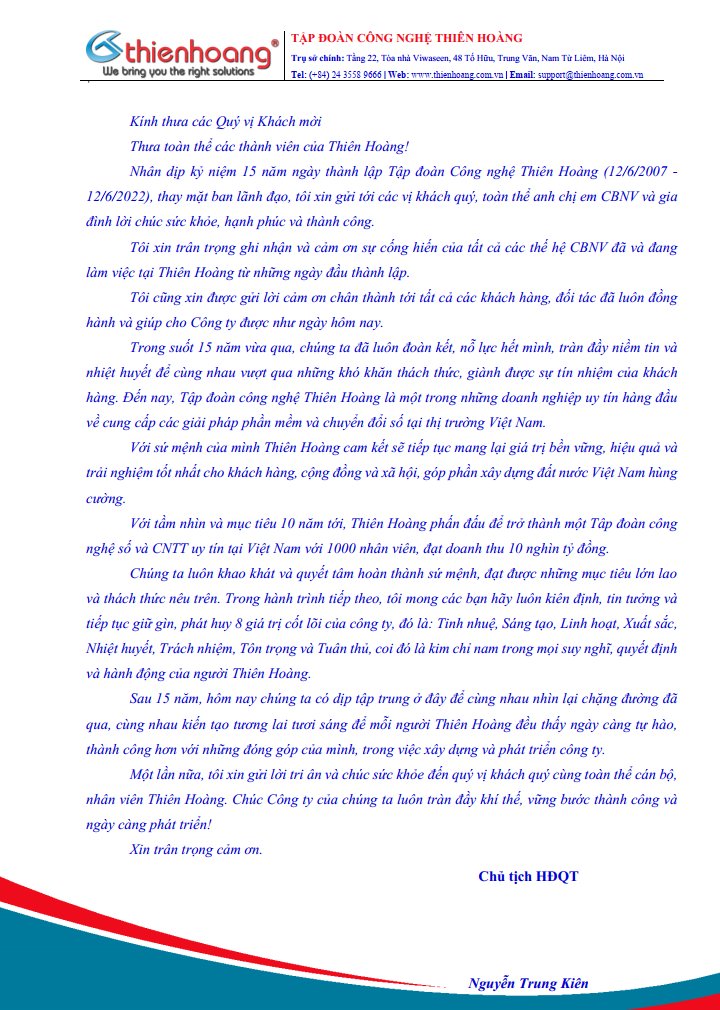 Kỷ niệm 15 năm thành lập công ty, những cán bộ nhân viên của Thiên Hoàng cùng nhìn lại chặng đường đã qua, để cùng nhau phấn đấu & tin tưởng rằng, với sự tín nhiệm của khách hàng, với bề dày kinh nghiệm & thành tích đã đạt được trong thời gian qua, với sự đoàn kết trên dưới một lòng, với ý chí sáng tạo, nhiệt huyết của mỗi thành viên đại gia đình Thiên Hoàng, chúng ta chắc chắn sẽ vượt qua những khó khăn, thách thức, cùng nhau đưa con thuyền Thiên Hoàng đi tới những thắng lợi vẻ vang đang chờ phía trước.